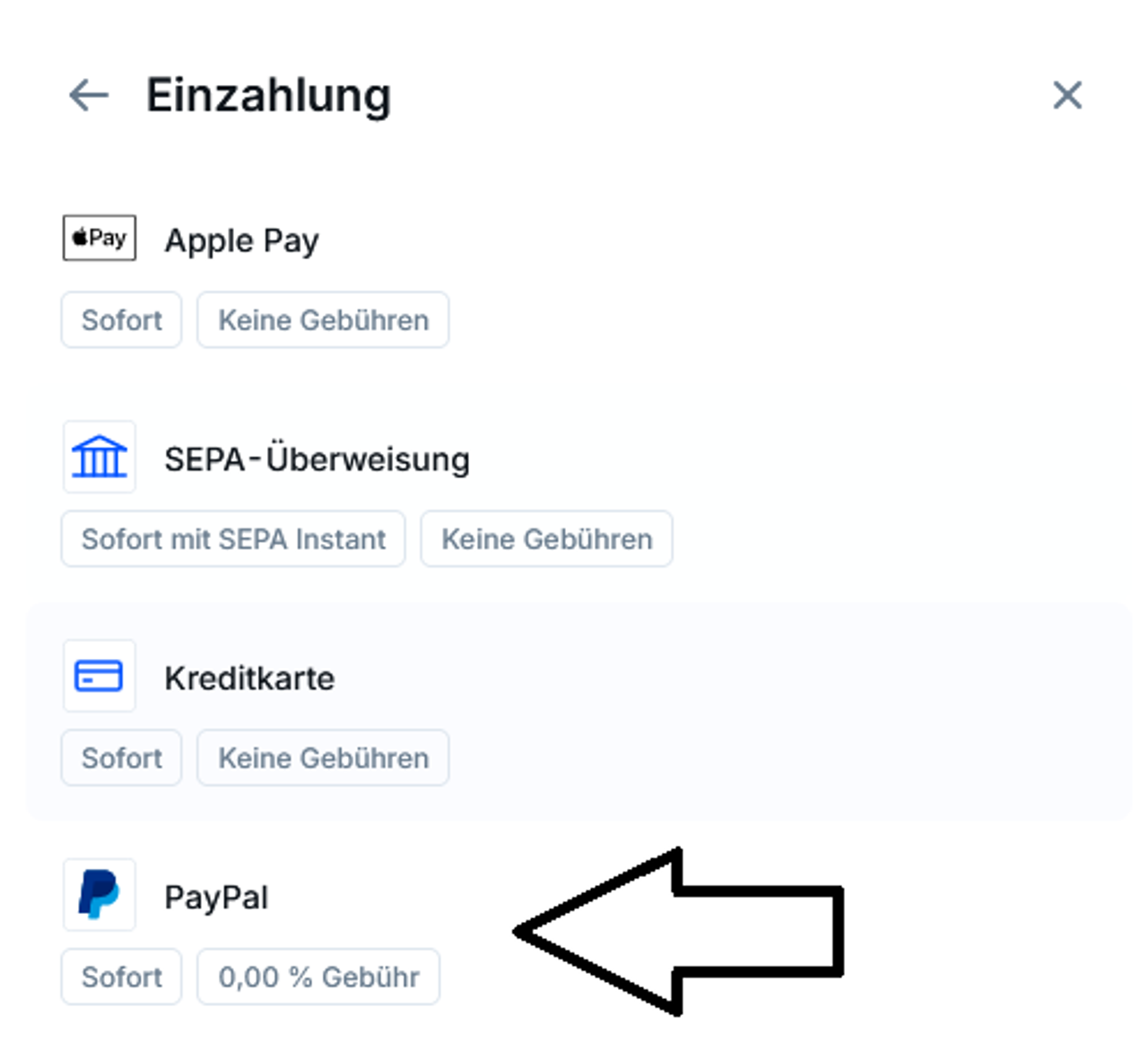 PayPal ist eine der einfachsten und schnellsten Einzahloptionen. Durch die Gebühren lohnt es sich jedoch nicht, auf jeder Krypto-Plattform diese Methode zu verwenden. Werden bei deinem Anbieter 2 – 3 % veranschlagt, solltest du überlegen, auf eine andere Einzahloption zu wechseln.