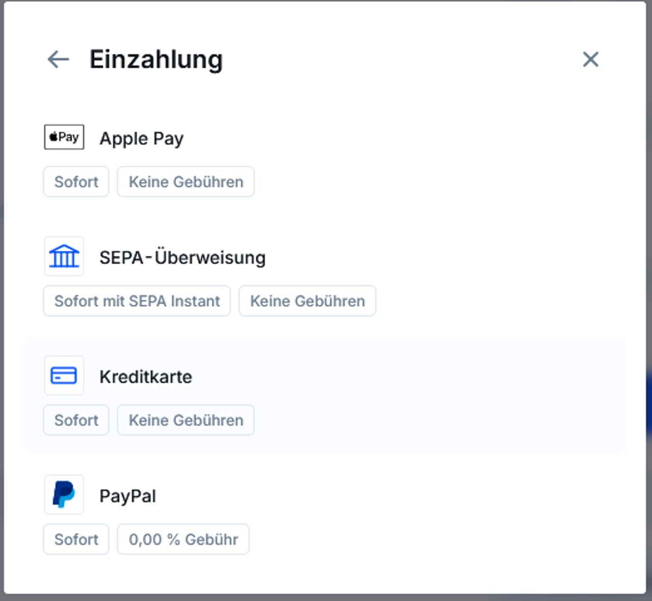 | Bitpanda | 1,49 % | Debit- oder Kreditkarte, PayPal, Klarna, Banküberweisung, Apple Pay | 25,00 € |